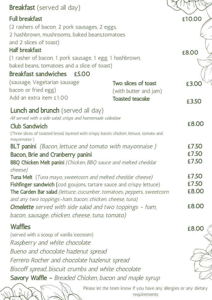 Outside of the Cafe Bar opening times the Garden Bar still serves Coffee (Shropshire coffee), Iced coffee, hot chocolate and hot chocolate with cream or Bailey's.